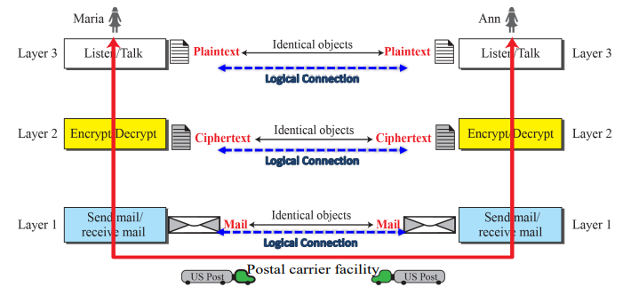 : Ex. Maria(Layer 3) → Encrypt(Layer2) → Send(Layer1) → Receive(Layer1') → Decrypt(Layer2') → Ann(Layer3')
